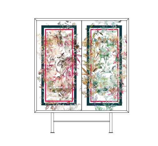 Буфет оснащен двумя дверками с механизмом открывания и закрывания push to open. Фасады декорированы рисунком.
