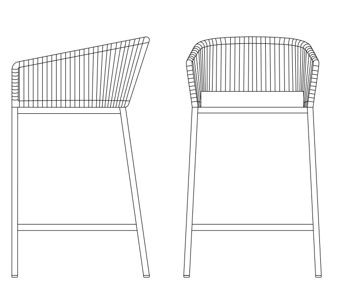Барный стул изготовлен из алюминия и плетеной ткани из полиэстра и полипропилена, устойчивой к воздействию окружающей среды. Сидение и спинка дополнены мягкими подушками из водоотталкивающей ткани.