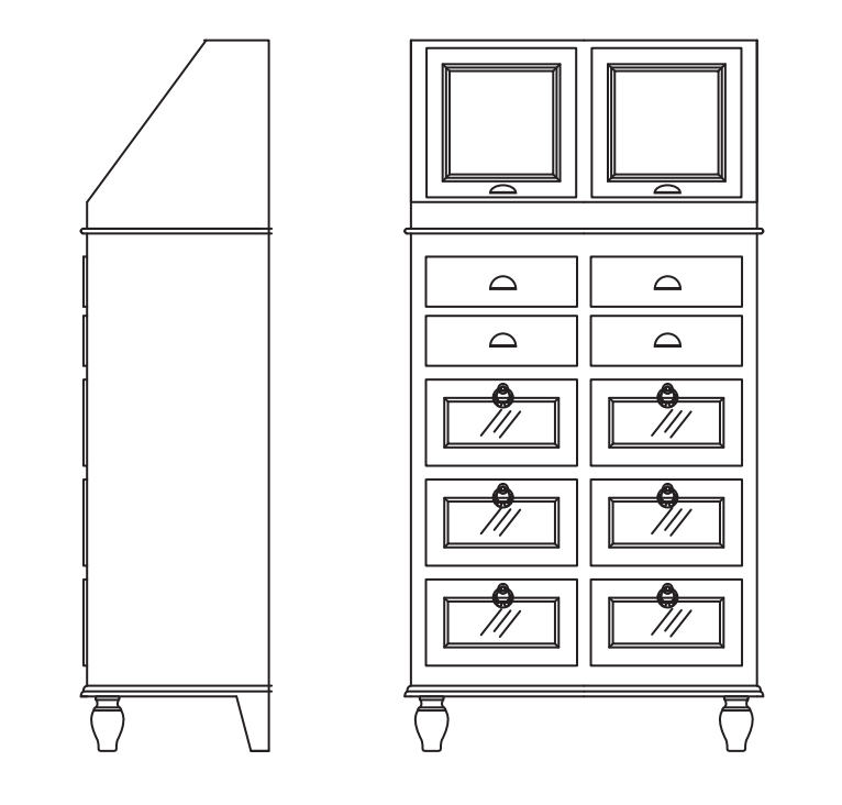 Буфет имеет десять ящиков, шесть из которых со стеклянной внешней частью, а также две полочки с откидывающимися стеклянными дверцами.