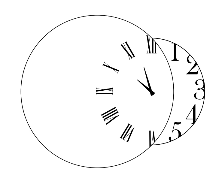Часы представляют собой две пересекающиеся зеркальные окружности с черными стрелками.