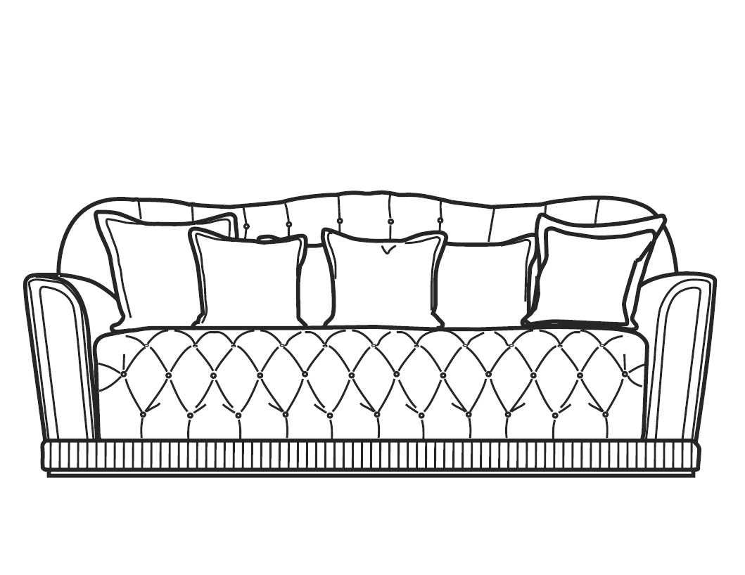 Диван с фигурной спинкой выполнен в классическом стиле. Декорирован стежкой капитоне. Передняя часть подлокотников с латунными вставками.