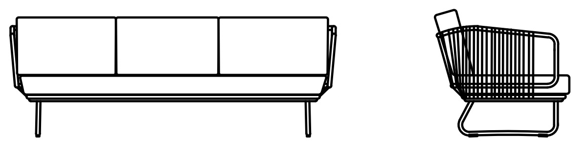 Диван имеет каркас из алюминия с порошковым покрытием. Изделие украшено плетением из синтетического волокна. Подушки обтянуты тканевой обивкой с наполнением из резины Dryfeel. Все материалы прекрасно отводят влагу, что делает изделие подходящим для использования на открытом воздухе. Тканевые чехлы съемные.