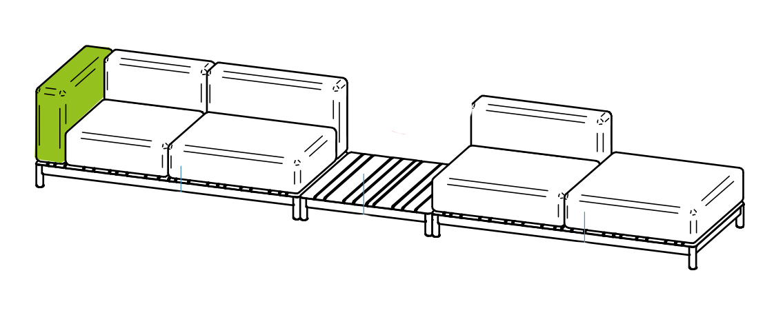Модульный диван имеет в основе спинок и подлокотников структуру из дерева окуме, видимая несущая структура - натуральное дерево тик с сертифицированных плантаций. Подушки сидения и спинки имеют наполнение из резины Dryfeel. Все материалы прекрасно отводят влагу, что делает изделие подходящим для использования на открытом воздухе. Тканевые чехлы съемные.
