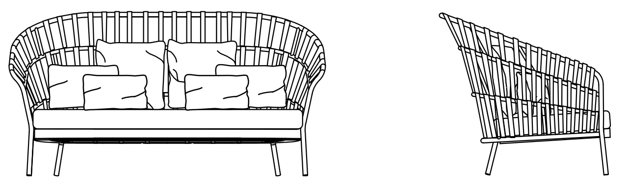 Диван имеет каркас из алюминия с порошковым покрытием. Спинка выполнена из алюминия с порошковым покрытием, имеет оплетку и красивое плетение из акриловой ленты Band. Сидение обтянуто тканевой обивкой с наполнением из резины Dryfeel. Все материалы прекрасно отводят влагу, что делает изделие подходящим для использования на открытом воздухе. Тканевые чехлы съемные. В комплект входит одна подушка сидения, шесть декоративных подушек под спину (65*65см-2шт., 60*40см-2шт., 50*30см-2шт.).
