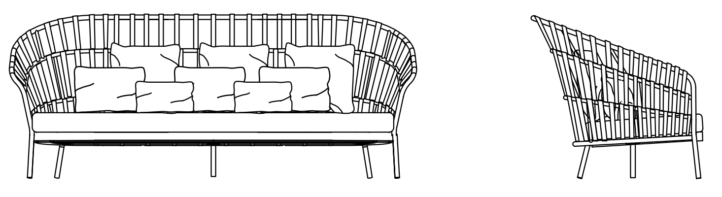 Диван имеет каркас из алюминия с порошковым покрытием. Спинка выполнена из алюминия с порошковым покрытием, имеет оплетку и красивое плетение из акриловой ленты Band. Сидение обтянуто тканевой обивкой с наполнением из резины Dryfeel. Все материалы прекрасно отводят влагу, что делает изделие подходящим для использования на открытом воздухе. Тканевые чехлы съемные. В комплект входит одна подушка сидения, восемь декоративных подушек под спину (65*65см-3шт., 60*40см-3шт., 50*30см-2шт.).
