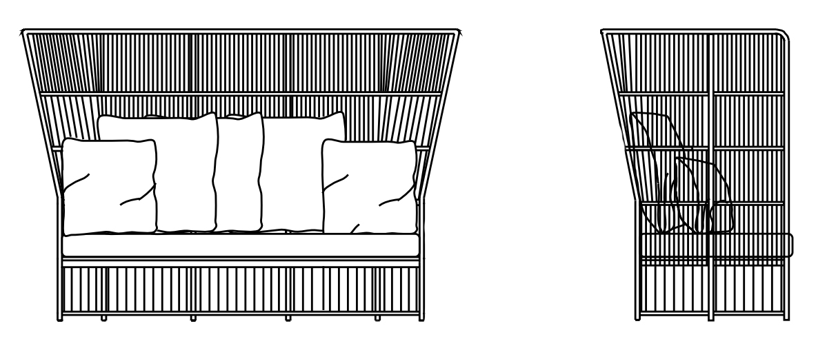 Диван имеет каркас из алюминия с порошковым покрытием. Спинка украшена плетением ручной работы. Сидение обтянуто тканевой обивкой с наполнением из резины Dryfeel. Все материалы прекрасно отводят влагу, что делает изделие подходящим для использования на открытом воздухе. Тканевые чехлы съемные. В комплект входит одна подушка сидения, пять декоративных подушек под спину (45*45см-2шт., 60*60см-3шт.).