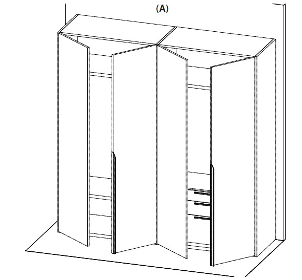 Внутреннее наполнение: две штанги для одежды, три полки, комод с выдвижными ящиками в одной секции шкафа.