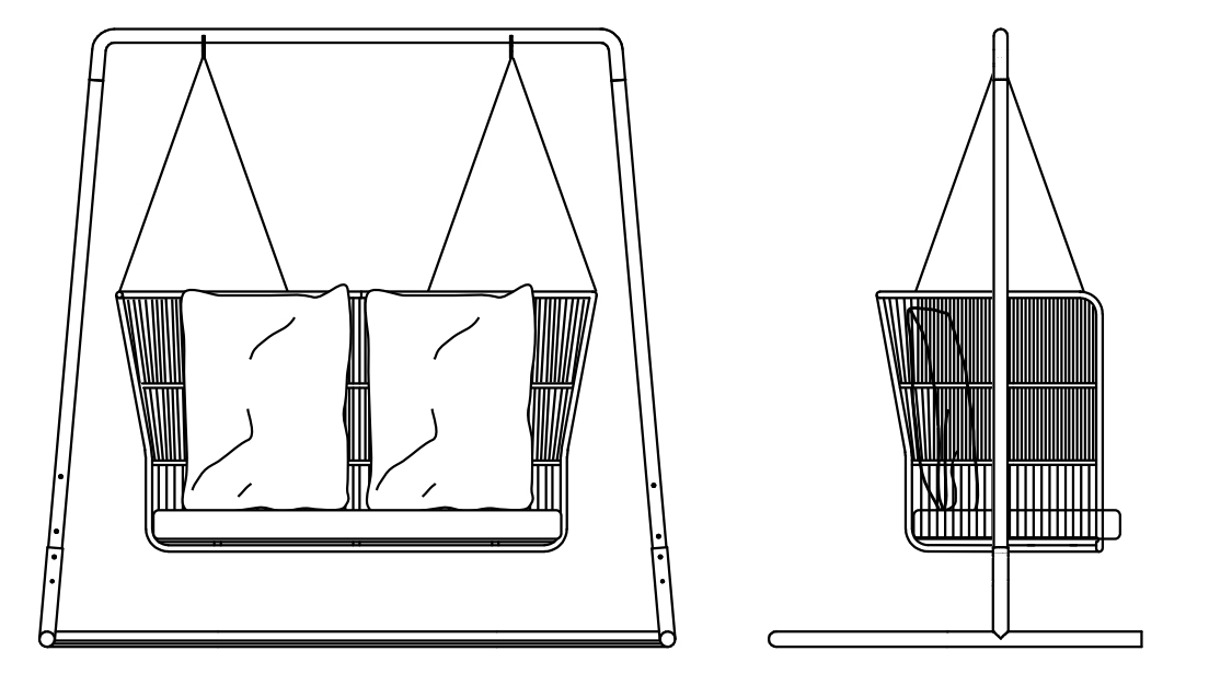 Несущая конструкция выполнена из стали с обработкой C5M (подходит для использования в морских районах) с порошковым покрытием. Качели имеют алюминиевую раму с порошковым покрытием. Спинка украшена плетением ручной работы. Сидение и спинка обтянуты тканевой обивкой с наполнением из резины Dryfeel. Все материалы прекрасно отводят влагу, что делает изделие подходящим для использования на открытом воздухе. Тканевые чехлы съемные. В комплект входит одна подушка сидения, две подушки под спину (55*75см).