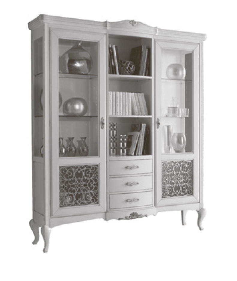 Книжный шкаф на гнутых ножках выполнен в классическом стиле. Верхняя часть карниза по центру украшены декоративным резным элементом, по бокам - фигурной планкой. Ажурные вставки в дверках из МДФ в серебре. Стеклянные - дверки, боковые стенки. Полки деревянные. Декоративная фурнитура - металл.
