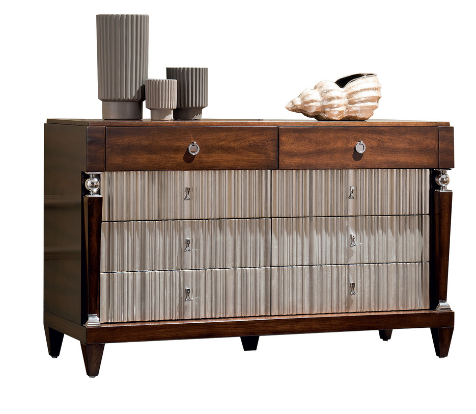 Роскошный комод с 8 ящиками в стиле неоклассика от итальянского бренда Fratelli Barri. Модель имеет фронтальную часть в отделке сусальным серебром, покрытым лаком шампань. К комоду можно подобрать идентичную по дизайну прикроватную тумбочку, высокий комод, кровать и другую мебель.