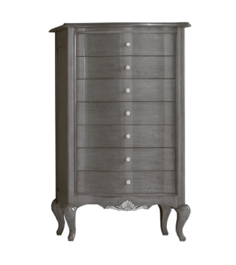 Комод с семью выдвижными ящиками выполнен в классическом стиле. Опирается на ножки кабриоли, нижняя часть царги украшена декоративным резным элементом.