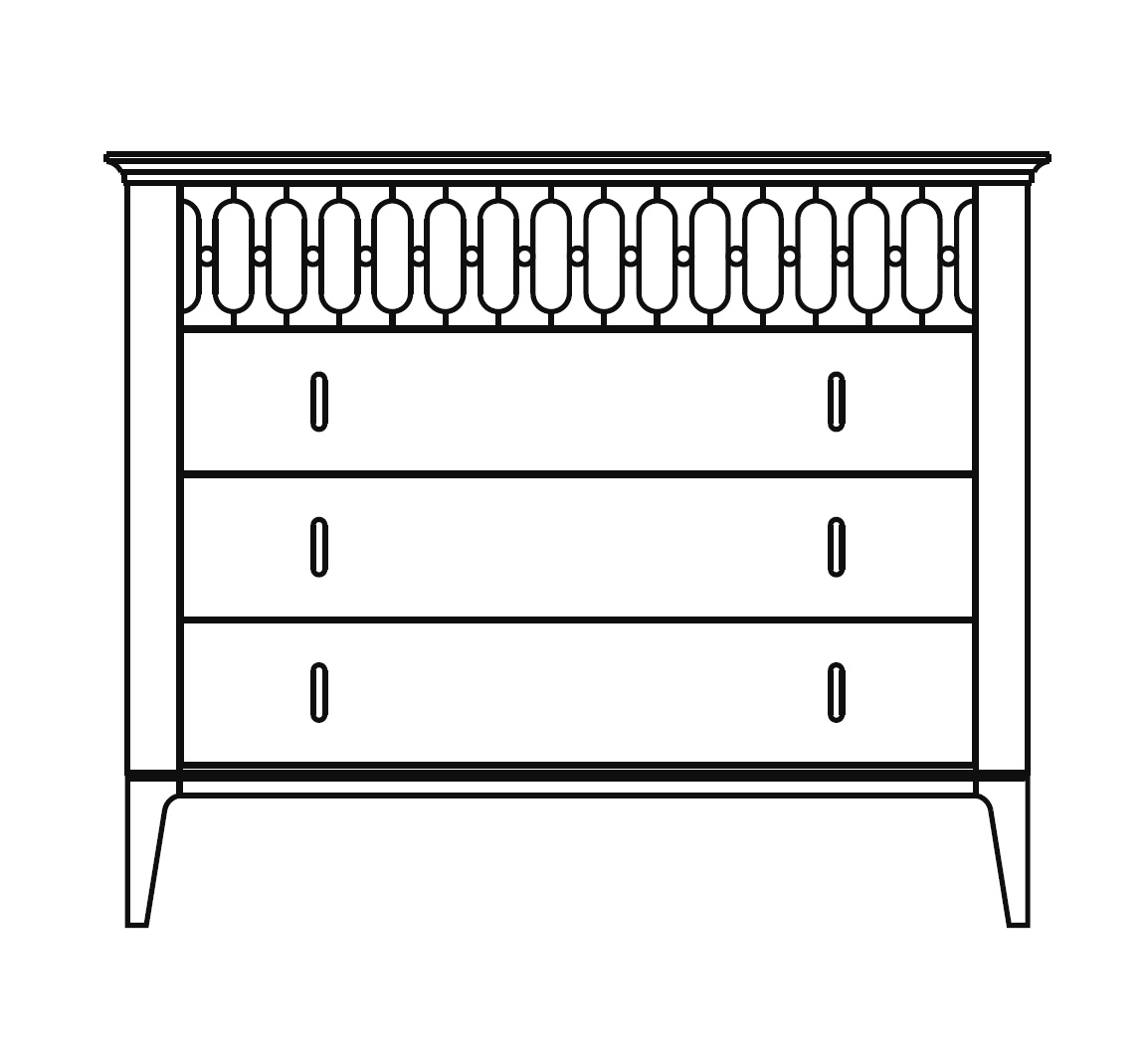 Комод на прямых ножках выполнен в стиле ар-деко. Оснащен четырьмя ящиками, верхний ящик с системой открывания push to open декорирован гравировкой.