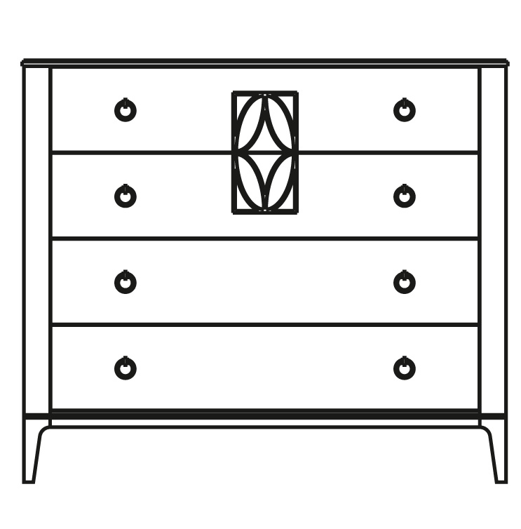 Комод на прямых ножках выполнен в стиле ар-деко. Оснащен четырьмя выдвижными ящиками с круглыми ручками. Фасады верхних ящиков декорированы гравировкой. Простые четкие линии и скругленные углы подчеркивают элегантность модели.