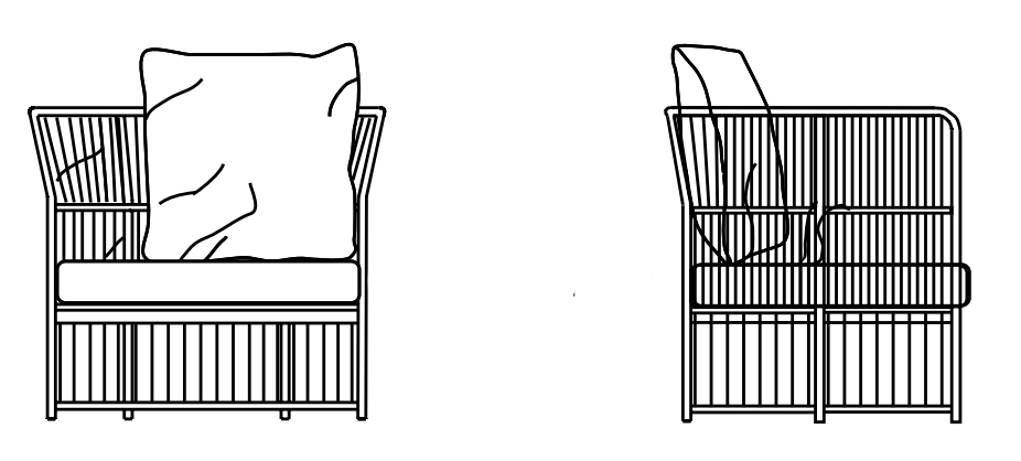 Кресло имеет каркас из алюминия с порошковым покрытием. Спинка украшена плетением ручной работы. Сидение обтянуто тканевой обивкой с наполнением из резины Dryfeel. Все материалы прекрасно отводят влагу, что делает изделие подходящим для использования на открытом воздухе. Тканевые чехлы съемные. В комплект входит одна подушка сидения, одна декоративная подушка под спину 60*60см.