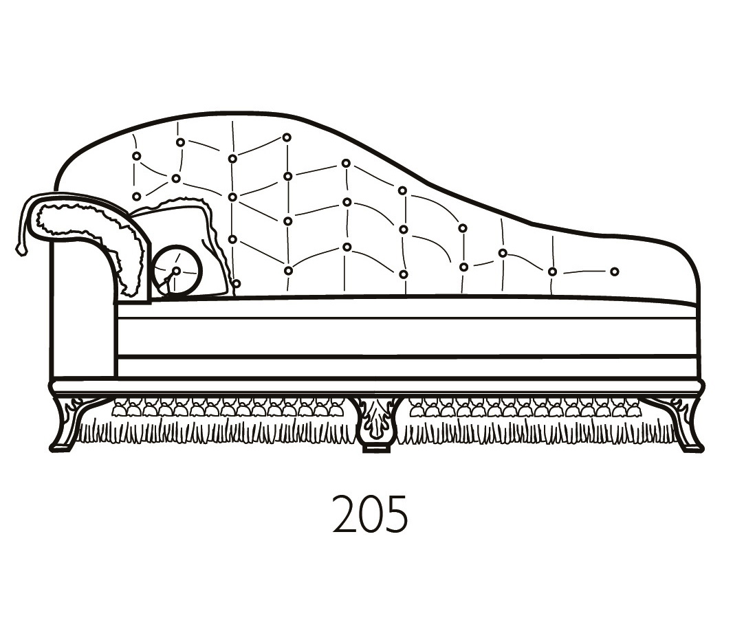 Кушетка на изогнутых резных ножках выполнена в классическом стиле. Внешняя часть спинки и подлокотников декорирована ромбовидной стежкой.