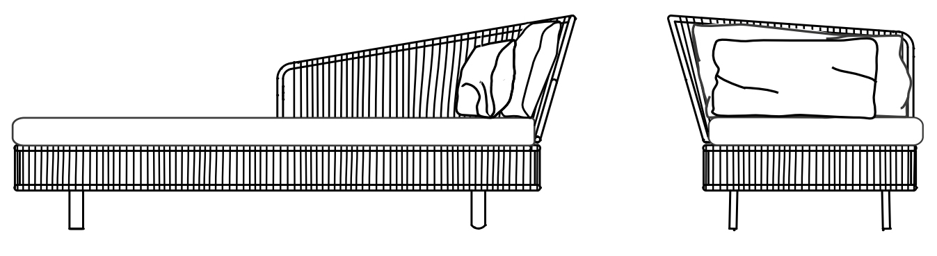 Кушетка имеет каркас из алюминия с порошковым покрытием. Спинка украшена плетением ручной работы. Сидение обтянуто тканевой обивкой с наполнением из резины Dryfeel. Все материалы прекрасно отводят влагу, что делает изделие подходящим для использования на открытом воздухе. Тканевые чехлы съемные. В комплект входит одна подушка сидения, две декоративные подушки под спину (75*45см. и 60*35см.). Две ножки имеют встроенные колесики для удобного перемещения кровати.