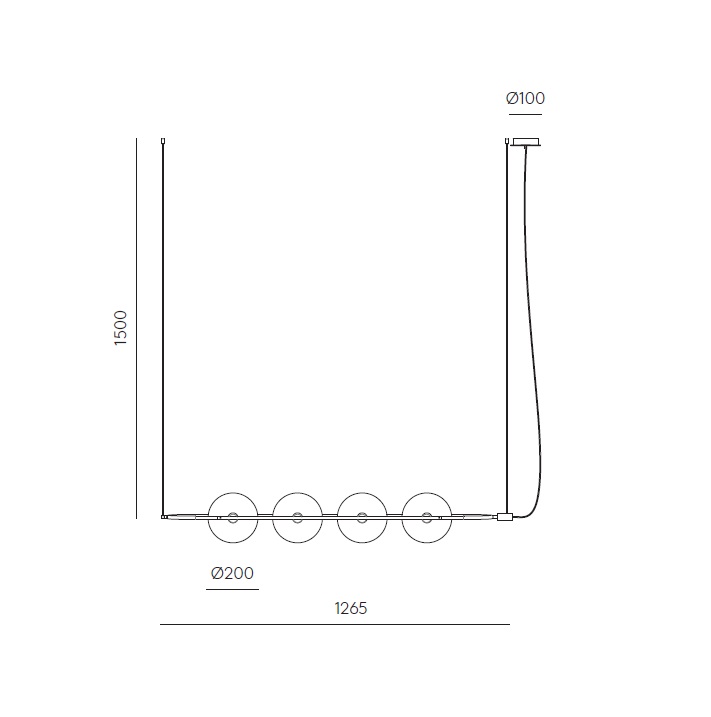 Подвесная конструкция из стали в черном матовом цвете и круглыми плафонами из белого матового стекла.