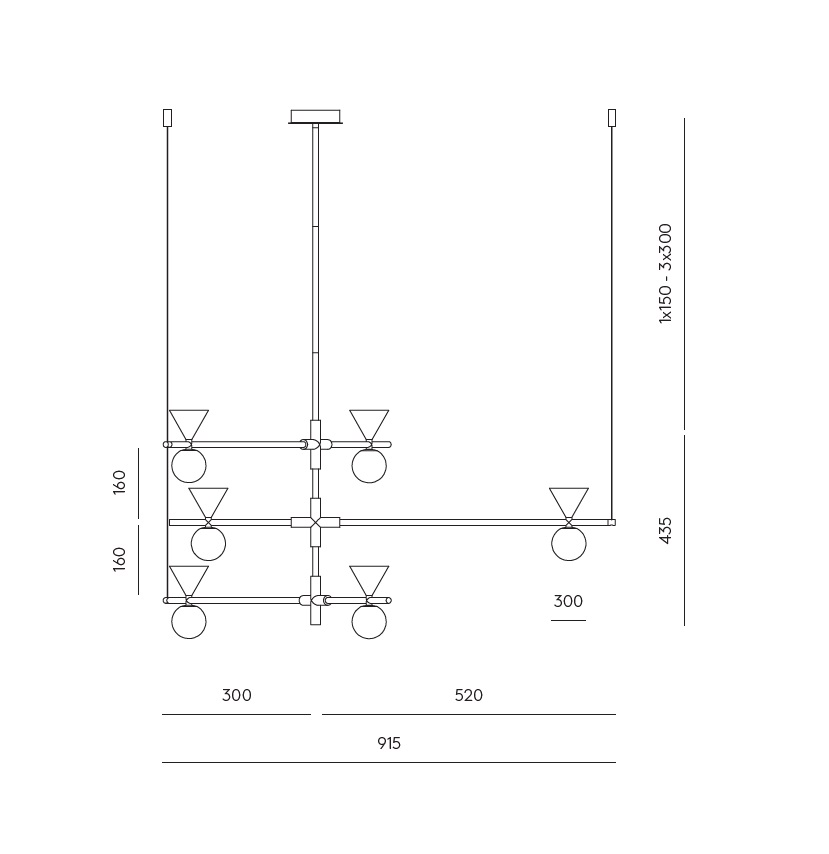Стальное основание в отделке состаренное золото дополнено шестью плафонами из белого матового стекла и декоративными элементами в виде конусов из светлого мрамора.