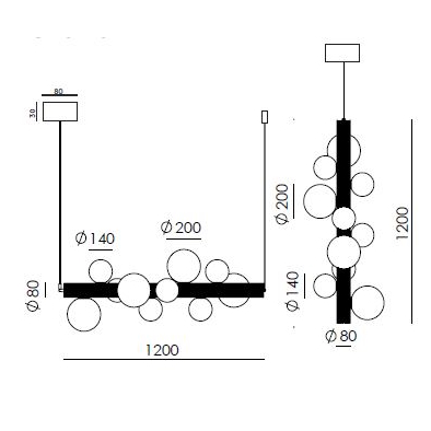 Люстра от испанского бренда Aromas del campo. Светильник состоит из прямоугольного основания, к которому присоединены плафоны. Шары диаметром 20 и 14 см. Основа металлическая, возможен вариант в черном цвете. Длину кабеля можно регулировать. В комплектацию входят десять энергосберегающих ламп со следующими характеристиками: тип цоколя – G9, мощность – 5W, световая температура – 2700К. Питание от сети. Для нормальной работы требуется напряжение 220-240 В, частота переменного тока 50-60 Гц. Размеры люстры: высота – 140-180 см, ширина – 48 или 120 см (зависит от положения), глубина – 48 см. Вес с упаковкой – 6,1 кг. Инструкция по монтажу включена в комплектацию