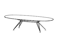 Овальный обеденный стол выполнен в современном стиле. Металлические ножки дополнены стеклянной столешницей.