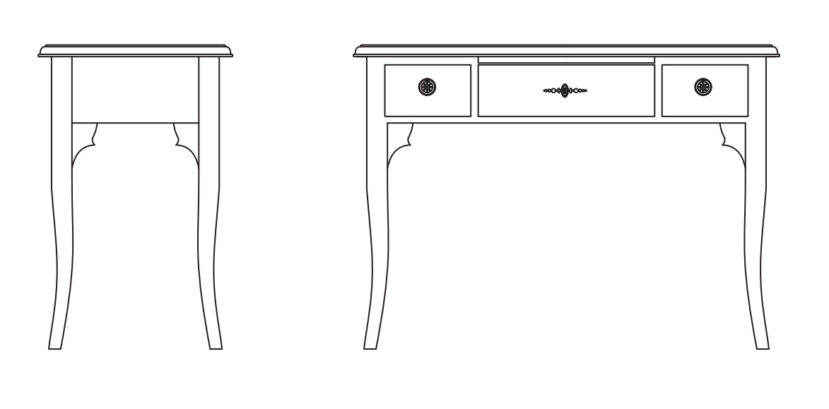 Письменный стол имеет прямоугольную форму. Оснащен тремя выдвижными ящиками и выдвижной поверхностью.