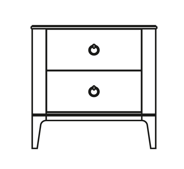 Прикроватная тумбочка на прямых ножках выполнена в стиле ар-деко. Оснащена двумя выдвижными ящиками с круглыми ручками. Простые четкие линии и скругленные углы подчеркивают элегантность модели.