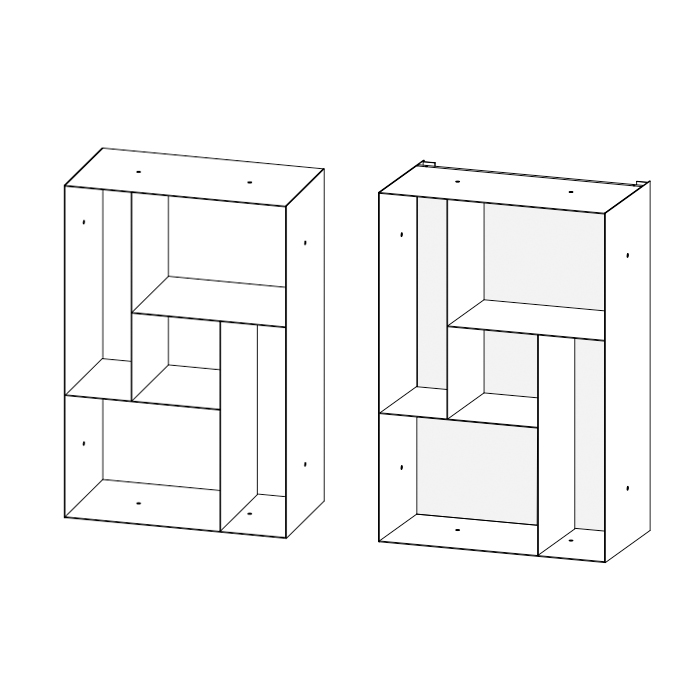 Металлический стеллаж цвета темной латуни состоит из 28 модулей двух видов, один из которых имеет заднюю стенку из мрамора.