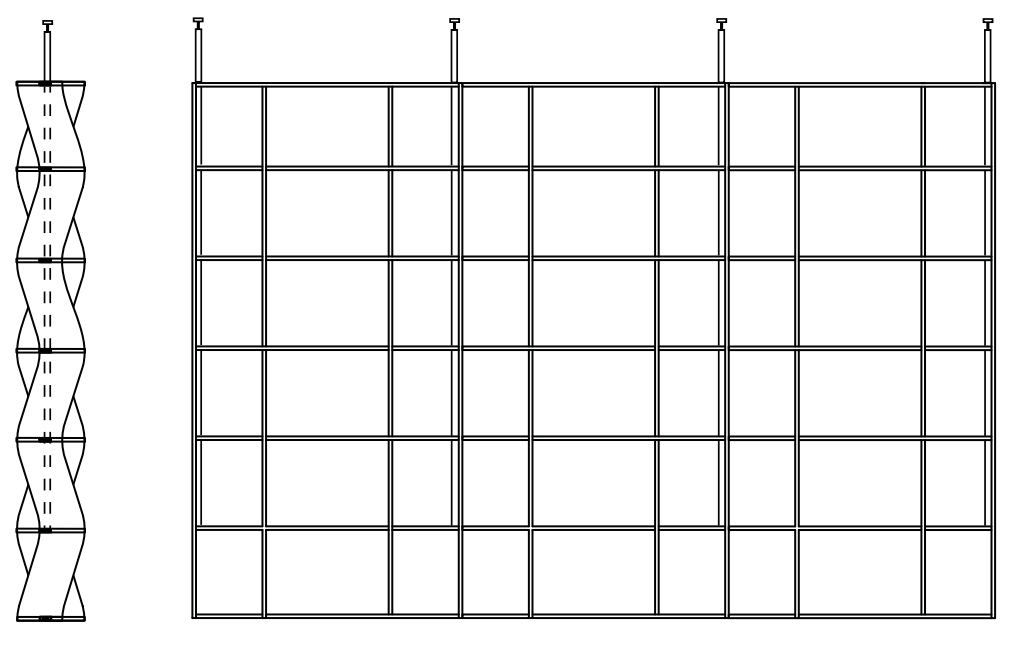 Стеллаж изготовлен из МДФ и покрыт лаком. Крепится к потолку благодаря металлическим телескопическим стойкам, выполненным в лаке того же цвета, что и сам стеллаж.