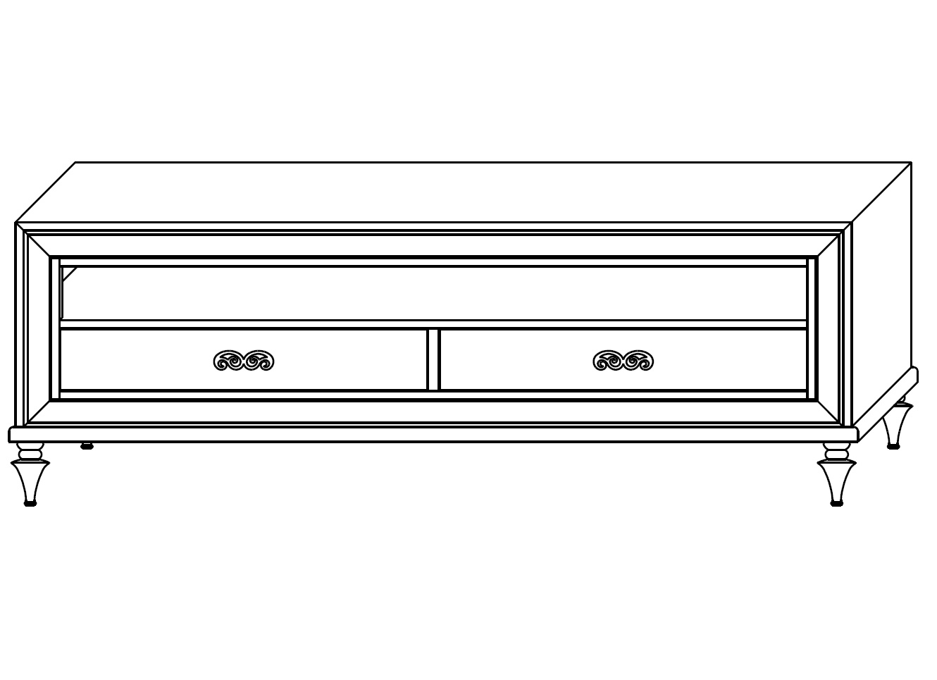 Тумба под TV на фигурных ножках выполнена в стиле ар-деко из массива корабельной сосны, поставляемой из Испании и Германии, высококачественного МДФ высокой плотности. Оснащена 2 выдвижными ящиками и открытой полкой.