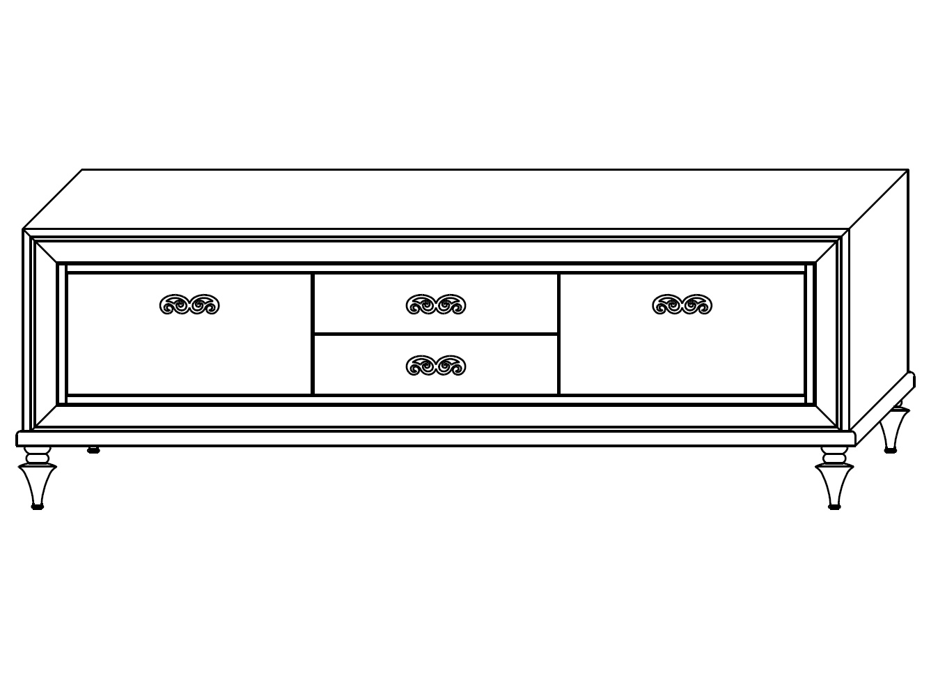 Тумба под TV на фигурных ножках выполнена в стиле ар-деко из массива корабельной сосны, поставляемой из Испании и Германии, высококачественного МДФ высокой плотности. Оснащена 2 дверками и 2 ножками.